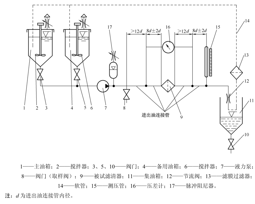3 在整個(gè)試驗(yàn)過(guò)程中, 應(yīng)小心控制裝有試驗(yàn)液的主油箱攪拌器的轉(zhuǎn)速, 以防止空氣進(jìn)入。 當(dāng)壓差計(jì)(16) 的靜壓差達(dá) 70 kPa 時(shí), 關(guān)閉液力泵(7) 和主油箱(1) 下面的出口閥門(mén)(3) , 并記錄計(jì)時(shí)器上的累計(jì)時(shí)間。