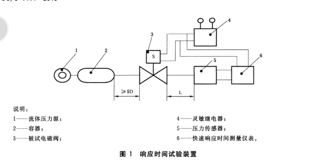 電磁閥人口側(cè)通以制造商規(guī)定的最大液體壓力,將額定電壓的通斷信號接人被測電磁閥控制電磁閥開閉,用壓力傳感器測量電磁閥出口側(cè)的壓力變化,并同時(shí)用快速響應(yīng)時(shí)間測量儀表測量從電壓通斷瞬間開始到壓力上升到最大值的90%(對常閉電磁閥而言)或壓力下降到最大值的10%(對常開電磁閥而言)的間隔時(shí)間,以重復(fù)試驗(yàn)三次取其算術(shù)平均值分別作為開啟時(shí)間或關(guān)閉時(shí)間,結(jié)果應(yīng)符合要求。
