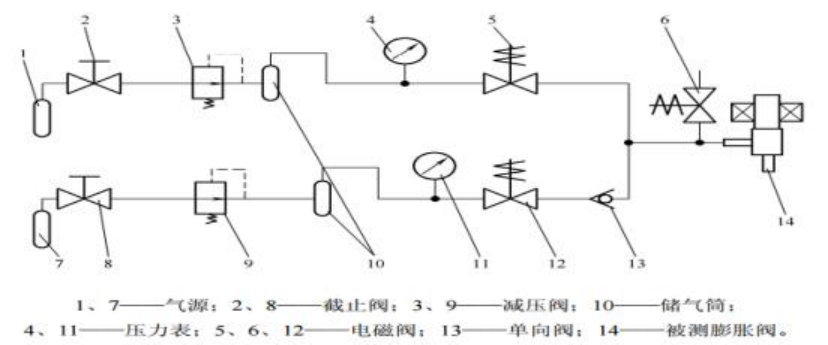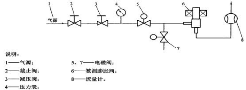關(guān)閉截止閥?8、電磁閥 ?6?、12,操作驅(qū)動(dòng)電源將膨脹閥設(shè)定在全閉狀態(tài),確定原點(diǎn);開(kāi)?啟截止閥 2 和電磁閥 5?、6,調(diào)整減壓閥?3 使壓力表 4?的指示壓力上升為 3.7MPa;設(shè)定?驅(qū)動(dòng)電源,?90%額定電壓,?驅(qū)動(dòng)輸入?300?脈沖將膨脹閥開(kāi)啟;?關(guān)閉截止閥 ?2 ?和電磁閥?5?、6,再開(kāi)啟截止閥?8?和電磁閥?6?、12,調(diào)整減壓閥?9 使壓力表?11?的指示壓力上升為?0.1MPa;?在膨脹閥出口端測(cè)定氣體流量值 ?Q2;?軟件能自動(dòng)顯示流量變化值(注:?(Q1- Q2)/Q1)?,并能判定流量變化值是否合格(±5%以內(nèi)為合格)?。
