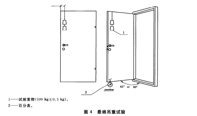 門扇開啟到90°士5°或45°士5°狀態(tài)下,記下百分表的讀數(shù)ho,在門扇頂端距門扇邊距50 mm的位置,施加(100士0.5)kg垂直載荷力保持5 min。試驗卸載5 min后,記下百分表的讀數(shù)h1,