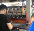 (1)同時使用六個工位,作為氣密性打壓實驗工位,人工在六個工位上擺放工件后,使用腳踏開關(guān)A觸發(fā)六個壓實氣缸壓實工件,使用腳踏開關(guān)B觸發(fā)頂升氣缸上升,頂升氣缸頂升水槽上升,將工件浸入水中。