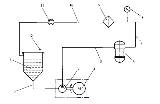 1——試驗(yàn)油箱;2——吸油管;3——葉片泵;4——變速電動機(jī);5、7——油管;;6——被試濾清器;8——壓力表;9——不銹鋼濾膜過濾器;10——回油管;11——流量計(jì);12——通氣孔