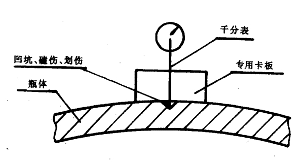 a)凹坑、磕傷、劃傷深度值以深處為準(zhǔn),測量用的專用量具如圖B2所示。卡板的型面曲率半徑與鋼瓶外廓相吻合,千分表的針尖插入缺陷中測量其深度,針尖的楔角應(yīng)小于等于30°,半徑應(yīng)小于等于0.25mm。測量過程中要定期校核千分表的讀數(shù),以消除由于針尖磨損造成的誤差。