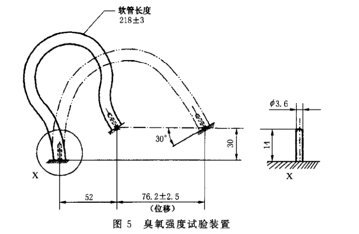 將軟管組合件裝配到動(dòng)態(tài)臭氧試驗(yàn)機(jī)上,并應(yīng)滿足圖5所示的相應(yīng)位置和屈撓參數(shù)。將長(zhǎng)度為218 mm士3 mm的軟管組合件插人臭氧試驗(yàn)裝置上定位銷,直至軟管組合件接觸到定位銷底部時(shí)為止,用帶箍將軟管組合件牢固地固定在定位銷上。