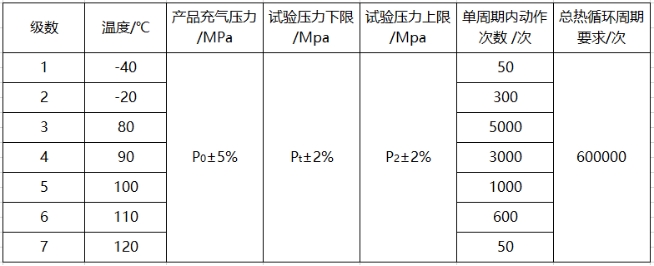 蓄能器壓力循環(huán)Pt→P5→Pt,在不同溫度下,進(jìn)行相應(yīng)的動(dòng)作次數(shù)。壓力控制精度±2%,溫度控制精度±3℃。P5值是可以設(shè)置的。
