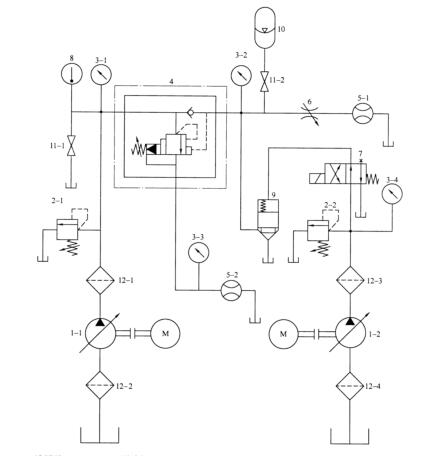 關閉截止閥11-1、11-2和節(jié)流閥6,調節(jié)溢流閥2-1和被試,使被試閥至調壓范圍上限值,并使通過被試的流量為試驗流量。