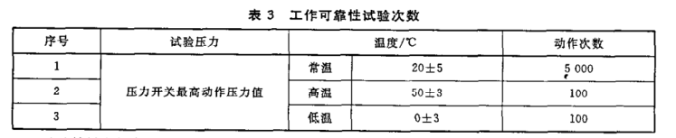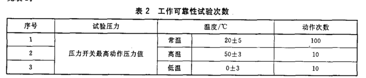 試驗(yàn)在常溫、高溫和低溫下進(jìn)行,高、低溫試驗(yàn)應(yīng)使壓力開(kāi)關(guān)至少在該環(huán)境中保持1h后進(jìn)行,次數(shù)見(jiàn)表 2.