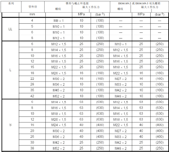1按照ISO8434本部分由碳鋼制造的接頭要滿足或超出真空6.5kpa(0.065bar)絕對(duì)壓力到表1